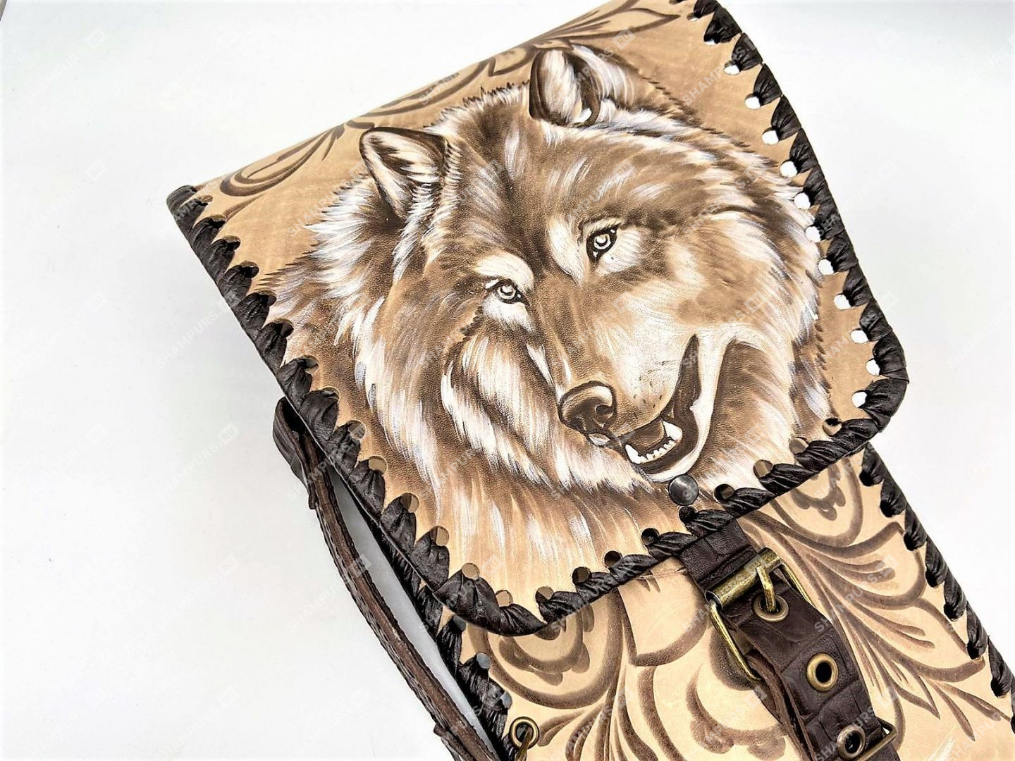 Изготовлен из натуральной кожи и оплетен кожаным шнуром.