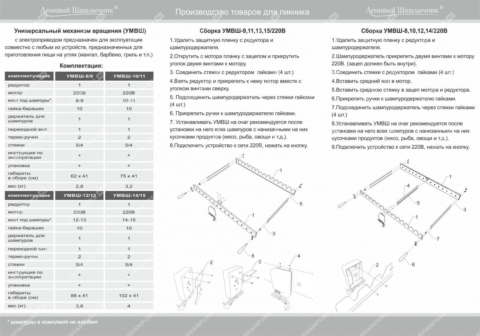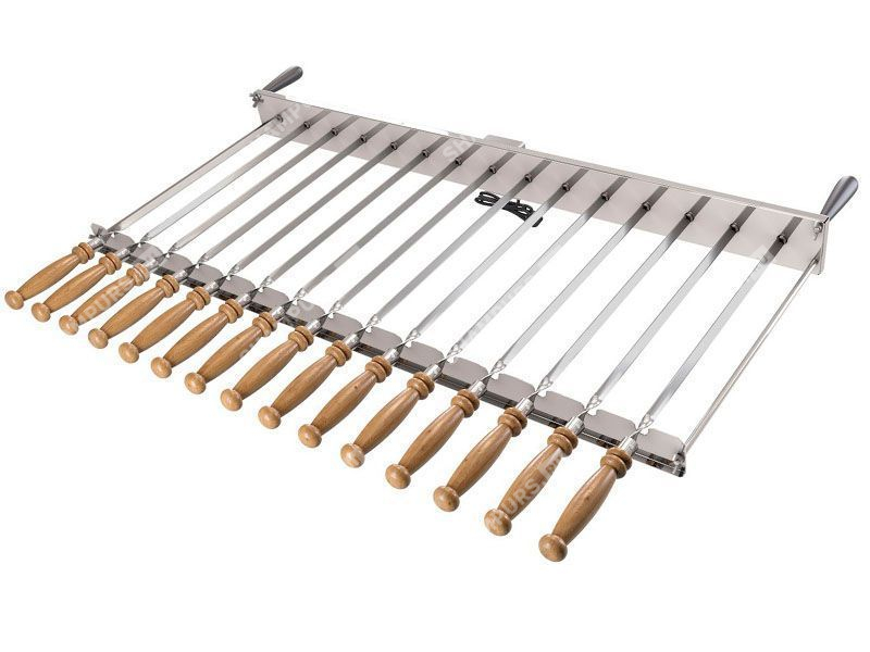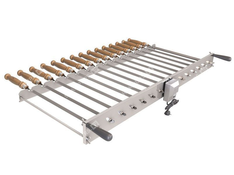 Шампуры-самокруты 8 Ленивый Шашлычник Данная модель механизма вращения шампуров комплектуется двигателем, который работает от сети. Редуктор вращает до 9 шампуров, имеются дополнительные прорези для плоских шампуров. Для удобства редуктор имеет съемные ручки из жаропрочного пластика.