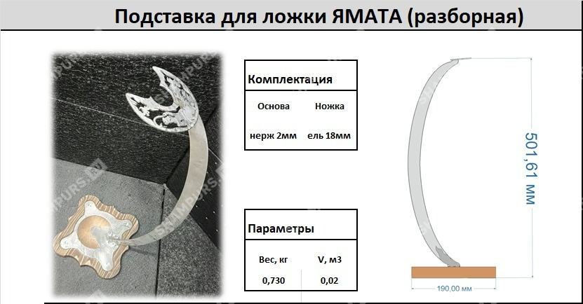 Подставка ЯМАТА изготовлена из тех же материалов, что и ложка. Подставка разборная. Основа подставки выполнена из фактурного дерева и не оставит царапин на вашем половом покрытии.