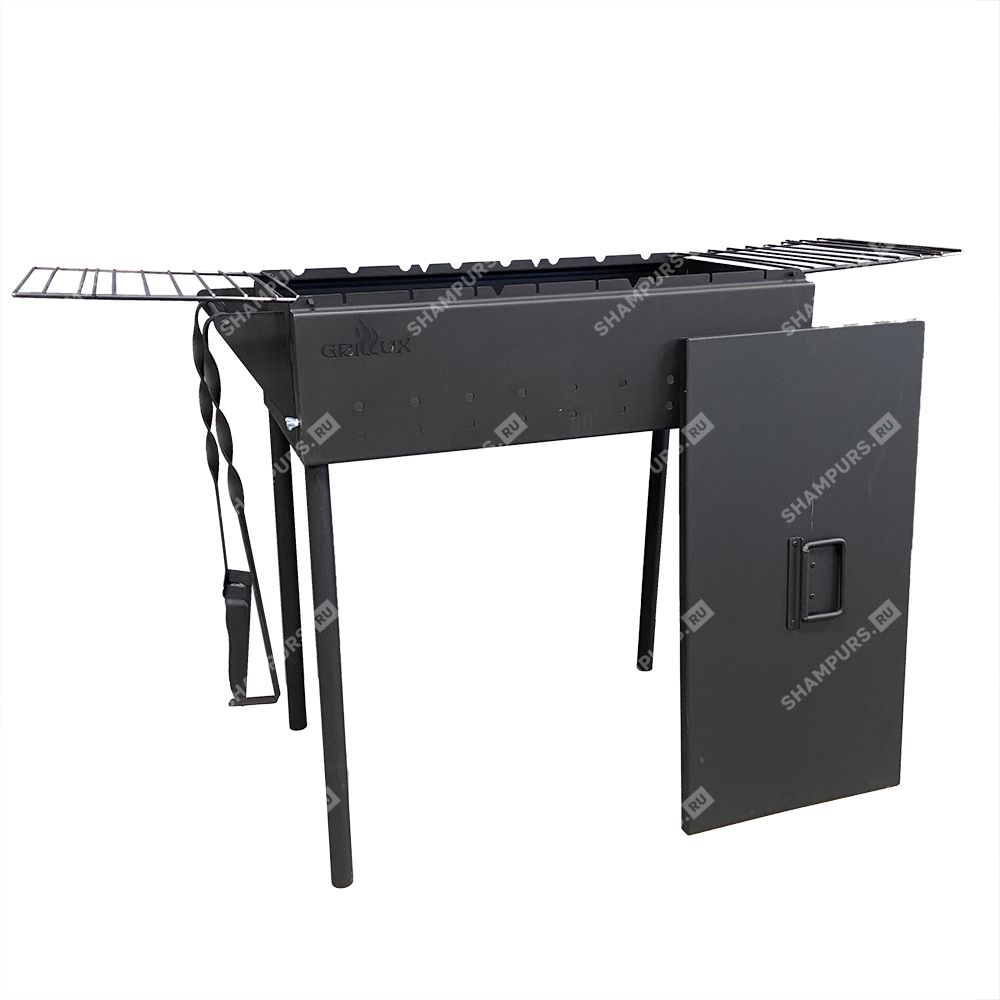 Устройство укомплектовано специальным совочком, кочергой и крышкой. Для удобного приготовления предусмотрены две откидные металлические решетки, используемые в качестве небольших полочек, на которые можно положить необходимые предметы.