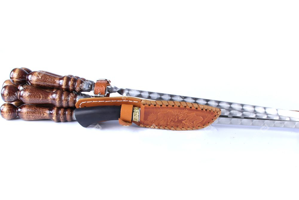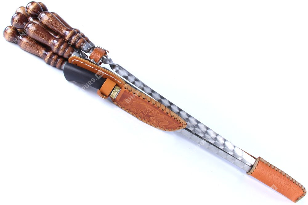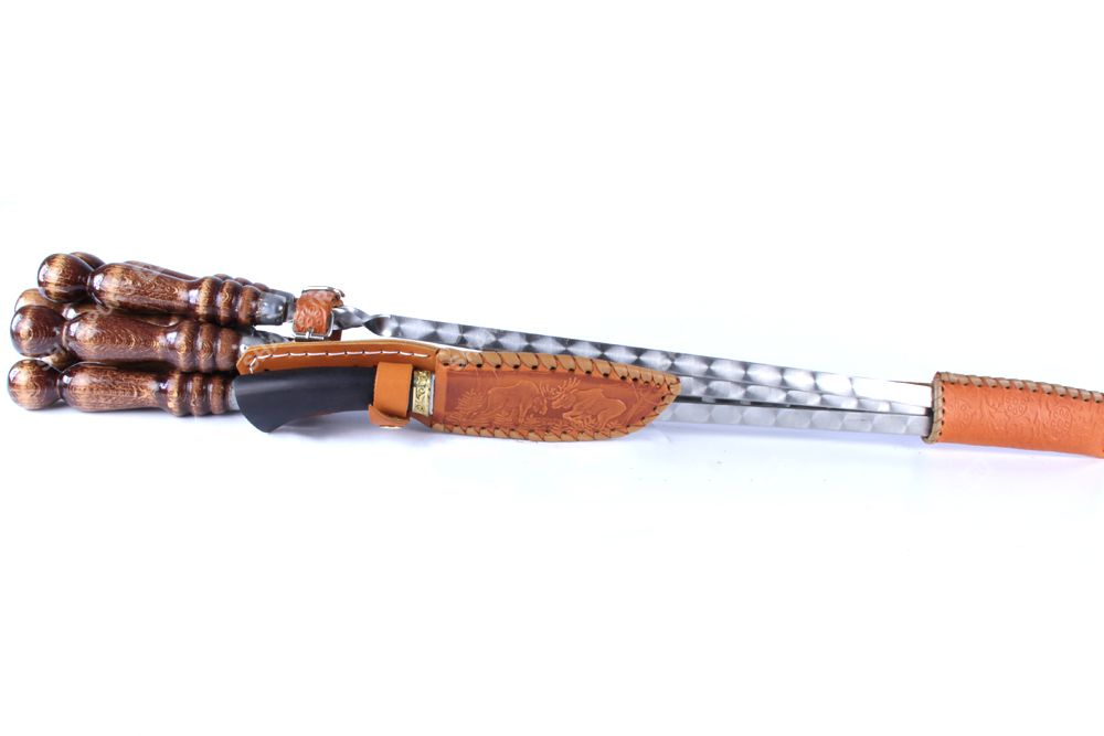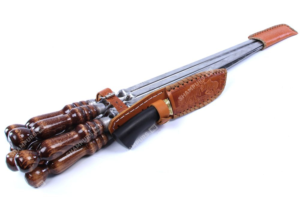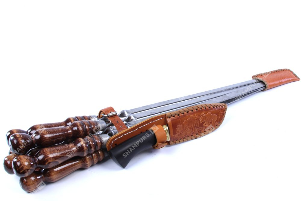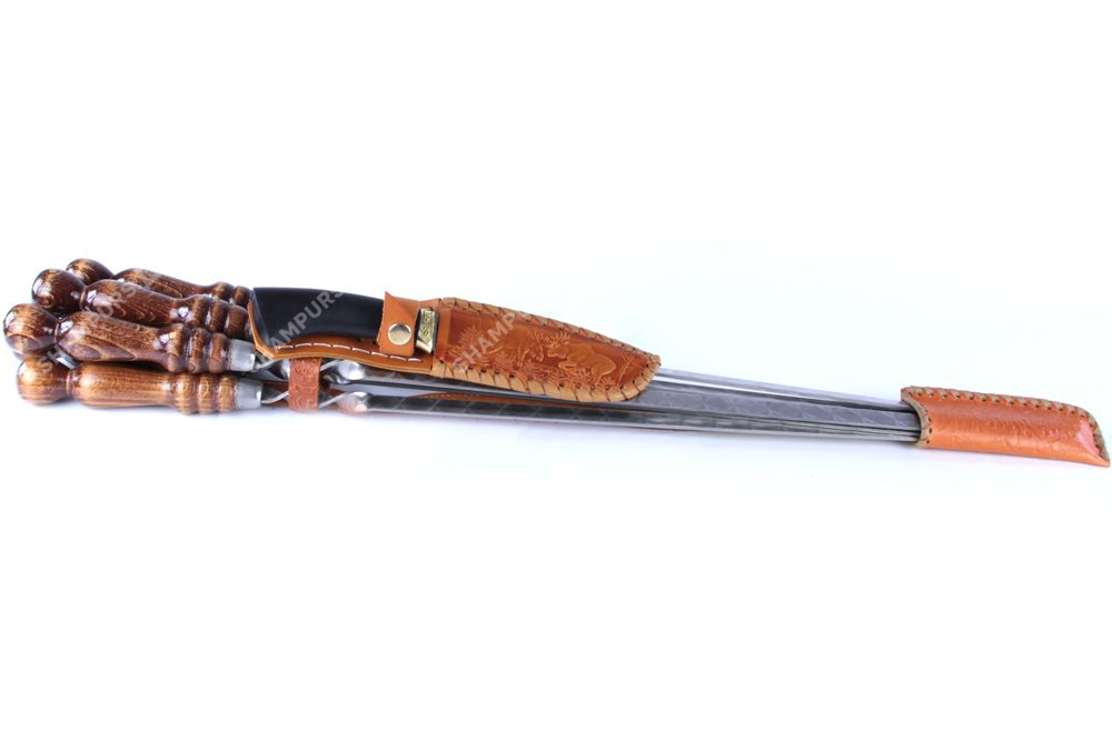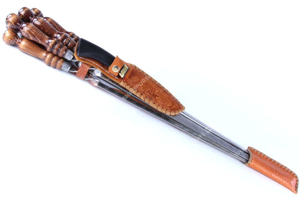 Колчан кожаный c ножом - 6 профессиональных шампуров с деревянной ручкой для люля - кебаб 14мм - 55 см