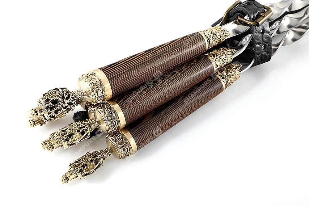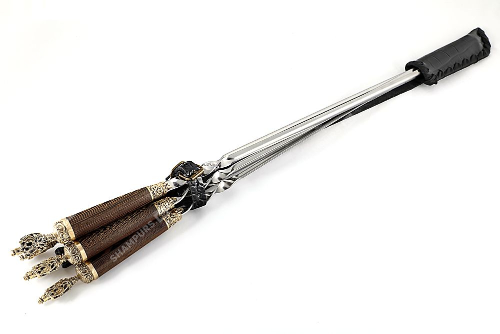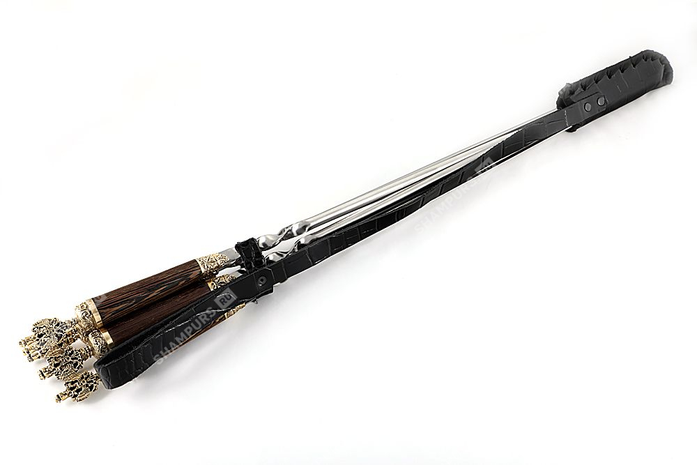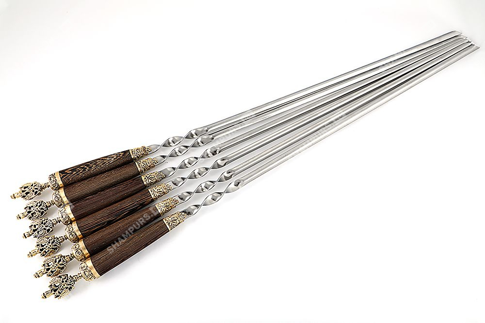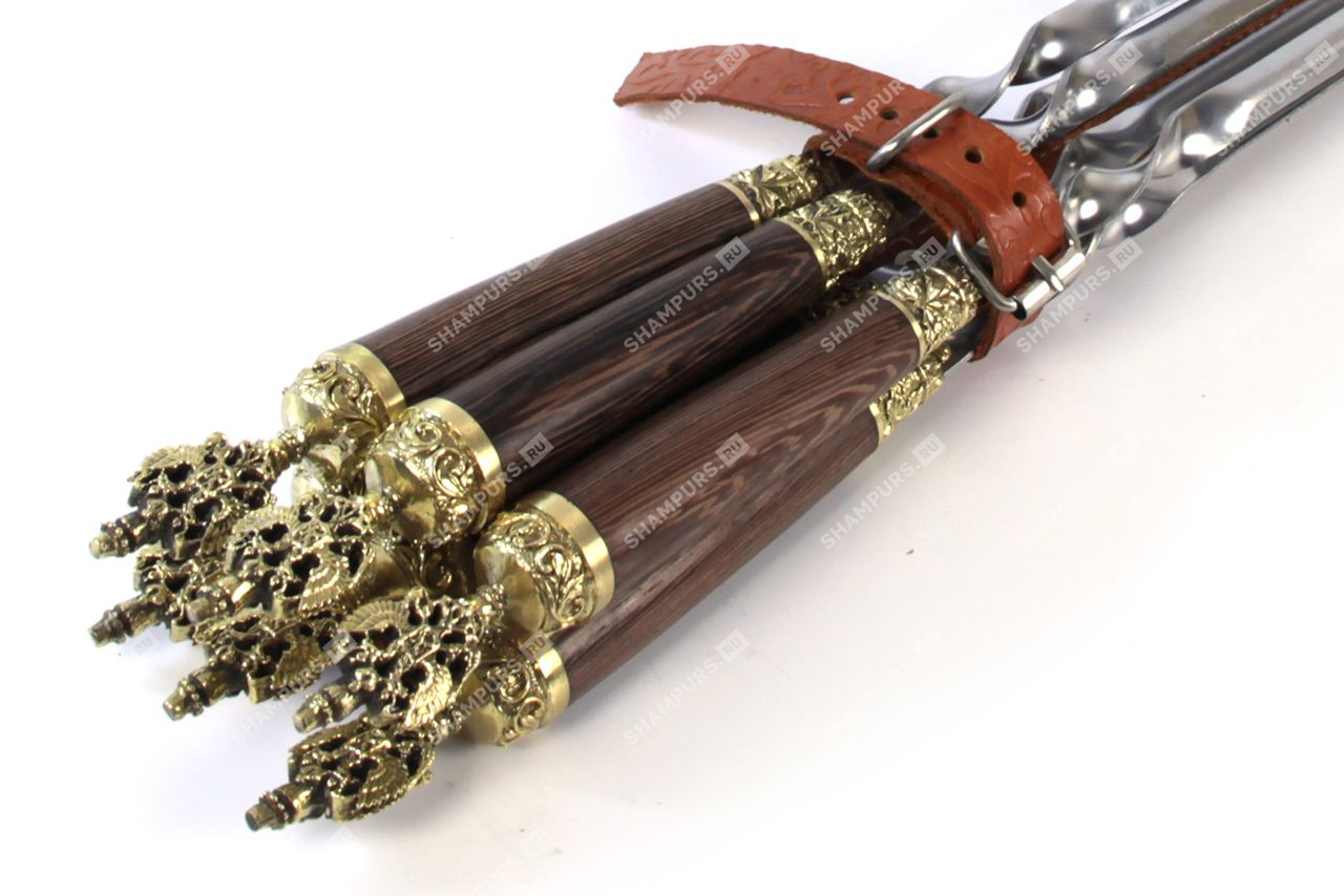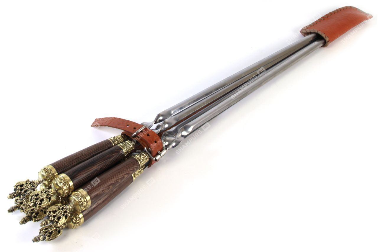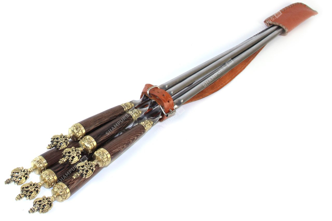 Шампура представляют собой настоящие художественные изделия, ведь рукоятки сделаны из натурального дерева - венге, а их верхушку украшает литой из латуни объемный герб Российской Федерации. Благодаря ручной работе, вс