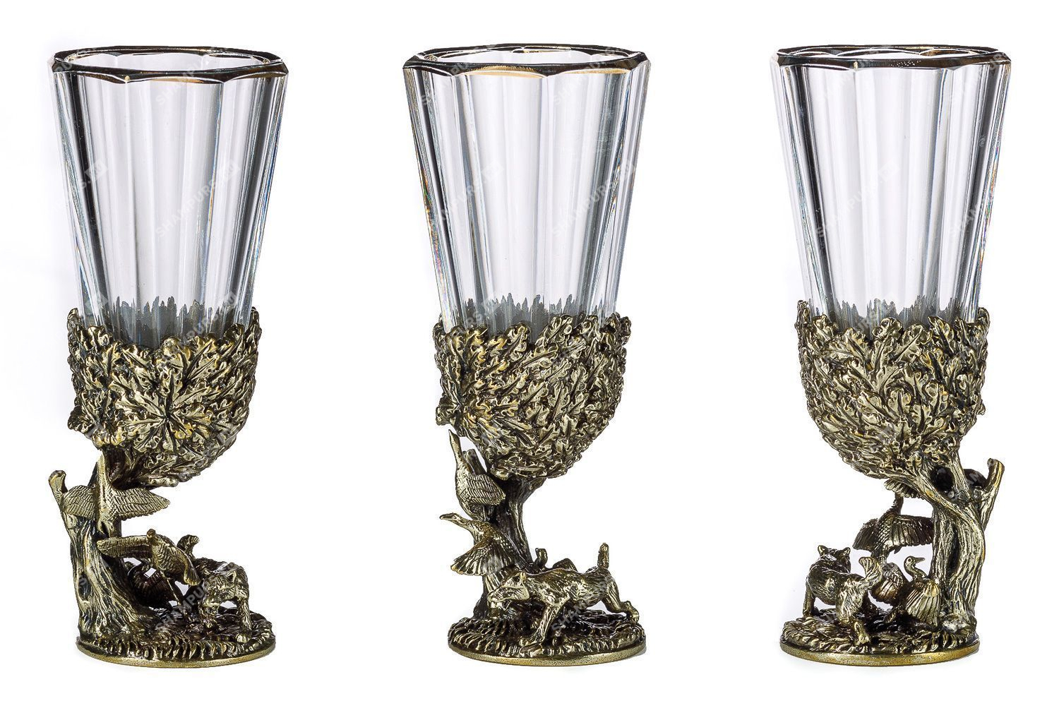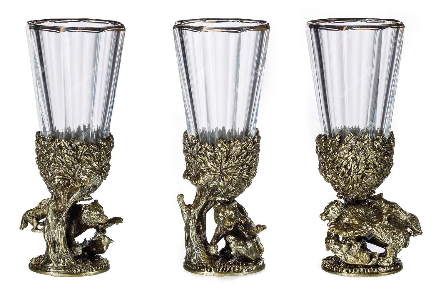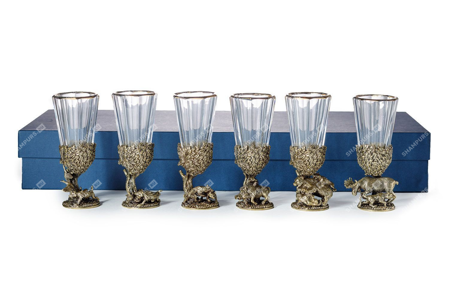 Комплектация: 6 рюмок (хрусталь), основание (латунь)