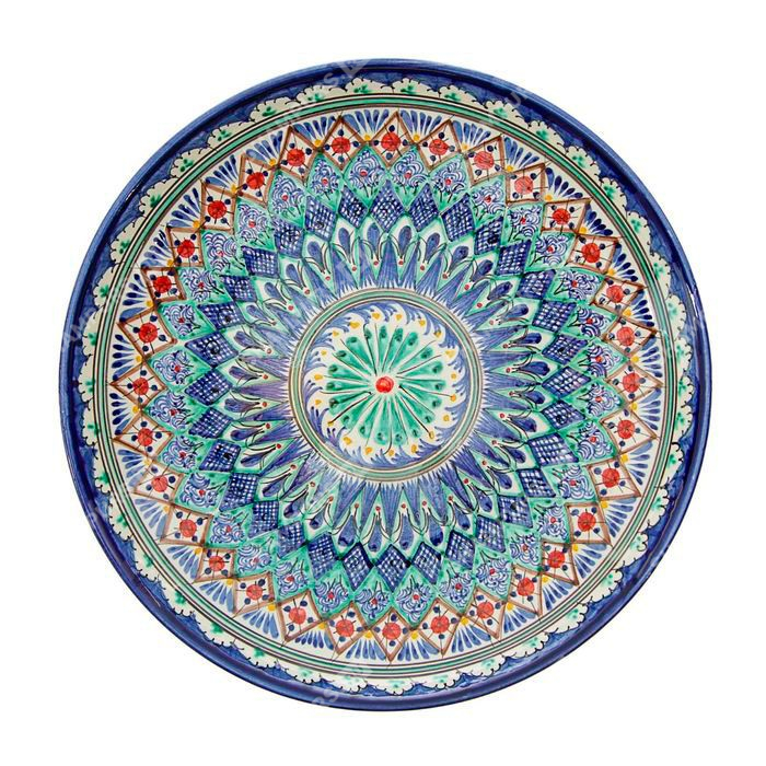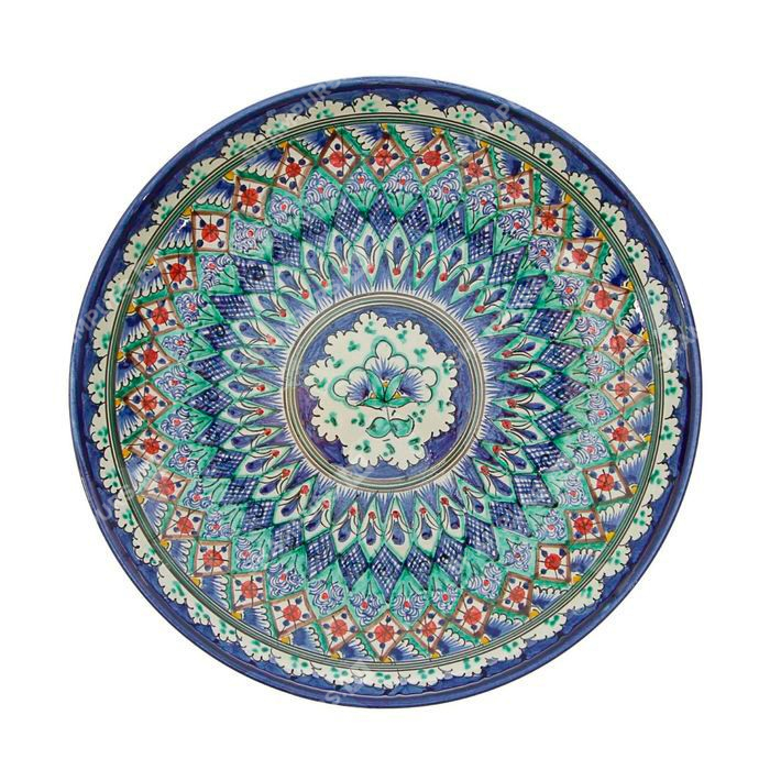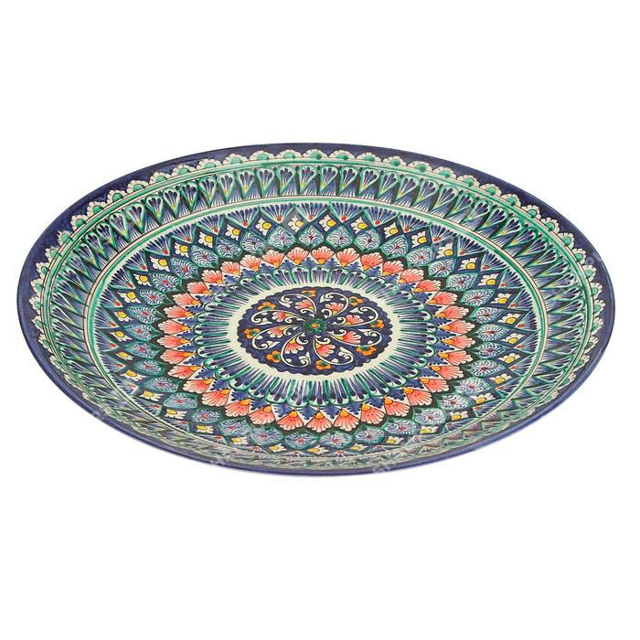 Блюдо для плова Риштан 32 см Ляган для плова сделан узбекскими мастерами в стиле старинных восточных традиций, которые насчитывают более тысячи лет. Блюдо декорировано ручной росписью в этническом стиле.