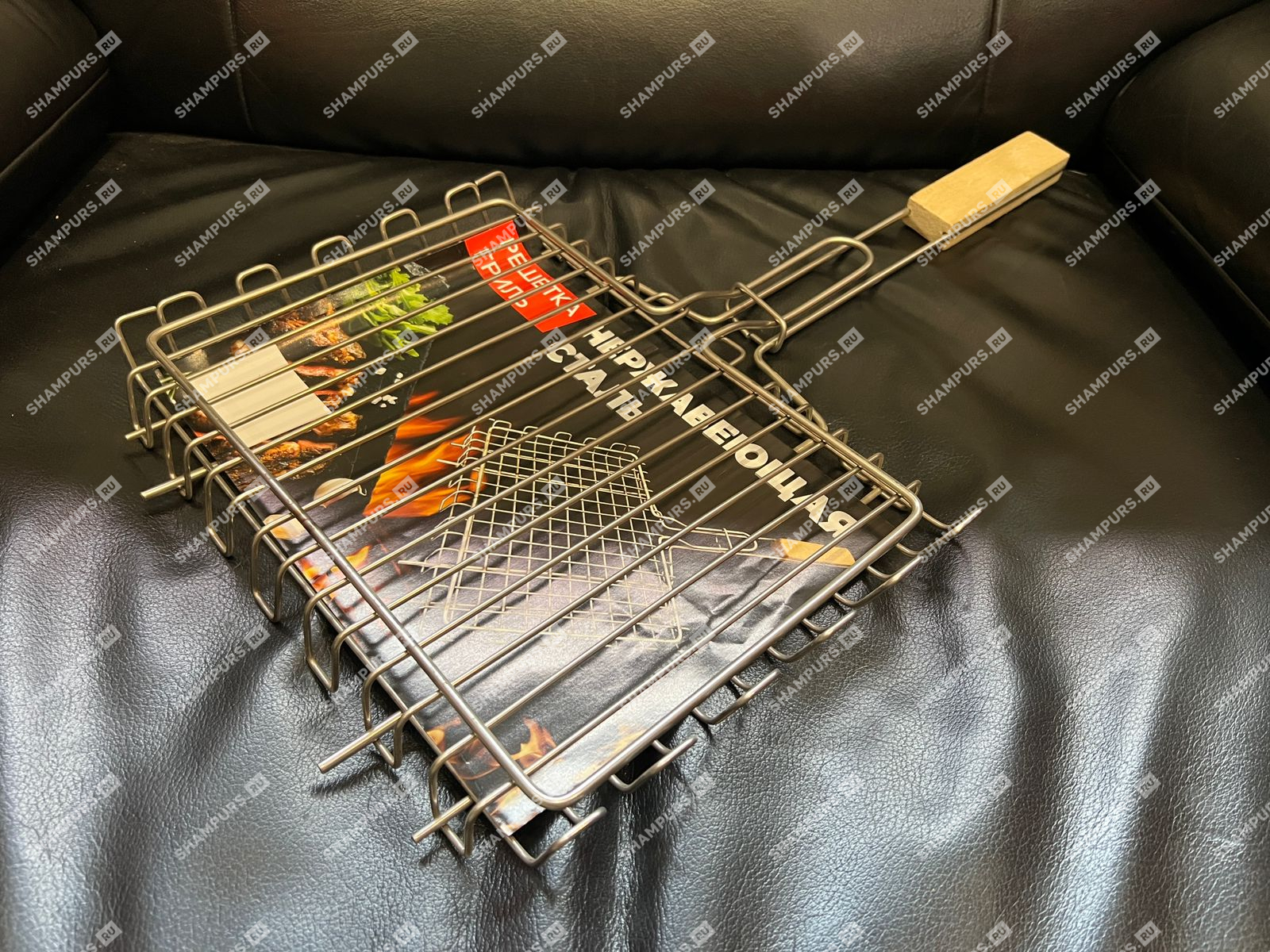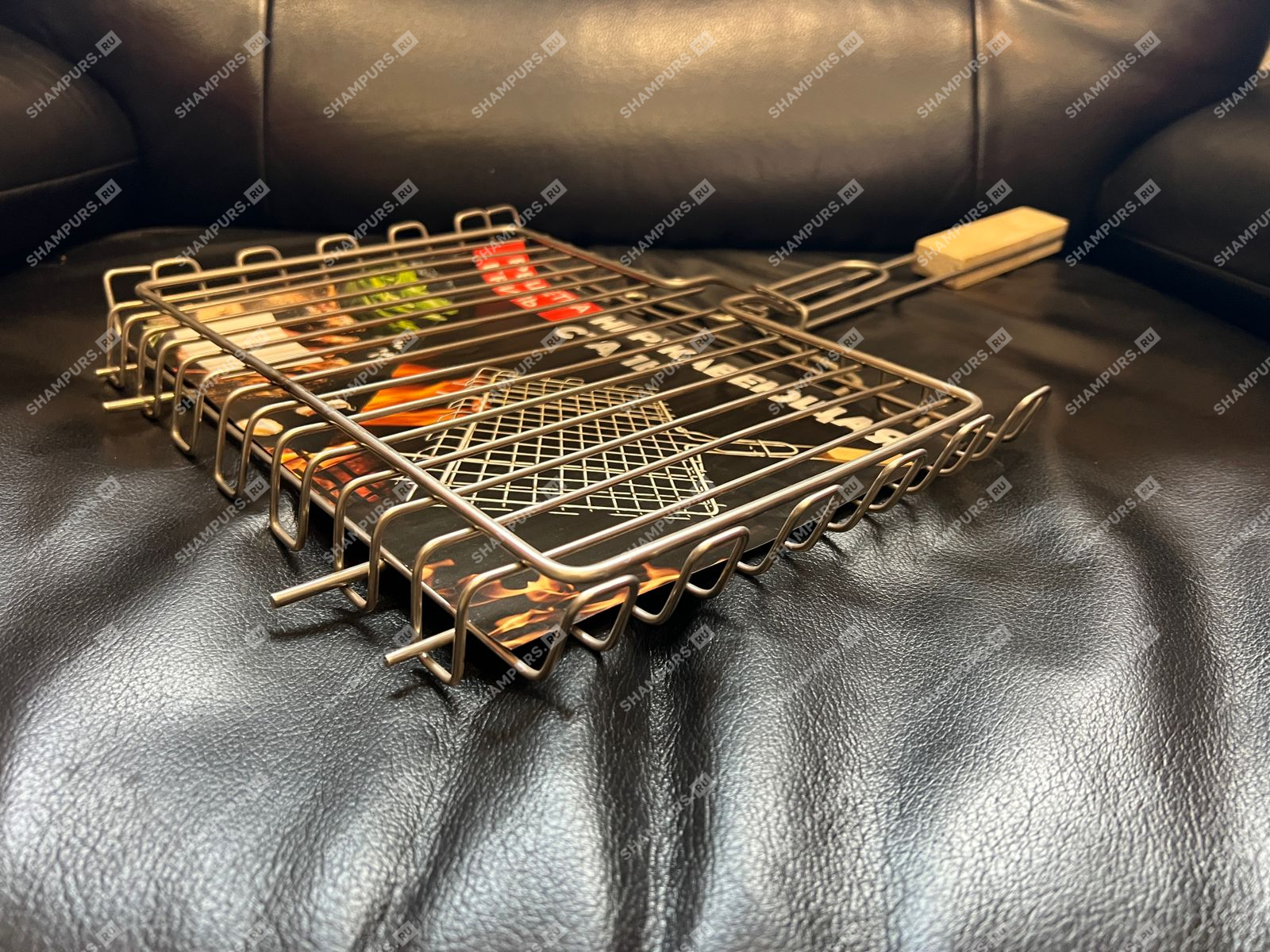 Решетка-гриль из пищевой нержавеющей стали AISI 304, раб часть 30х22 см, глубина 2,5см; толщина прутка решетки 2,5мм, на ручке - 4мм