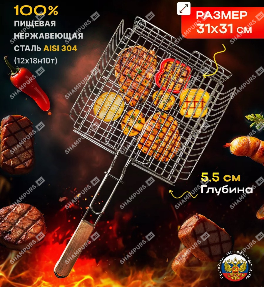 Рабочая часть 31х31 см, глубина 5,5см; толщина прутка решетки 2,8мм, на ручке - 5мм. длина ручки 33см