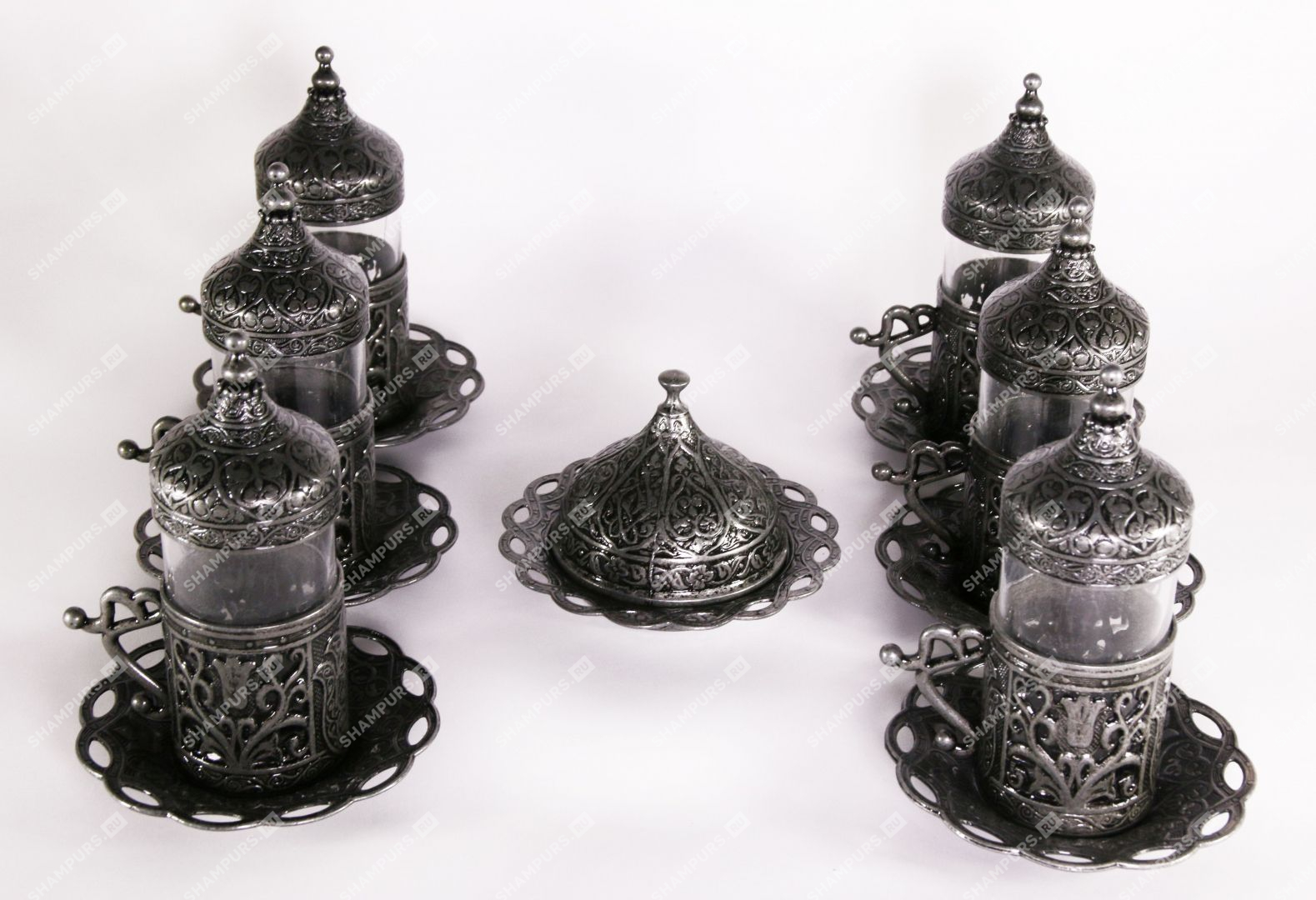 Восточный чайный сервиз на шесть персон с подносом античное серебро