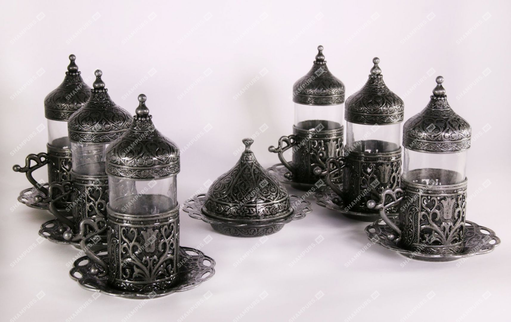 Восточный чайный сервиз на шесть персон с подносом античное серебро Чайный сервиз стекло+металл на 6 персон (27 предметов).