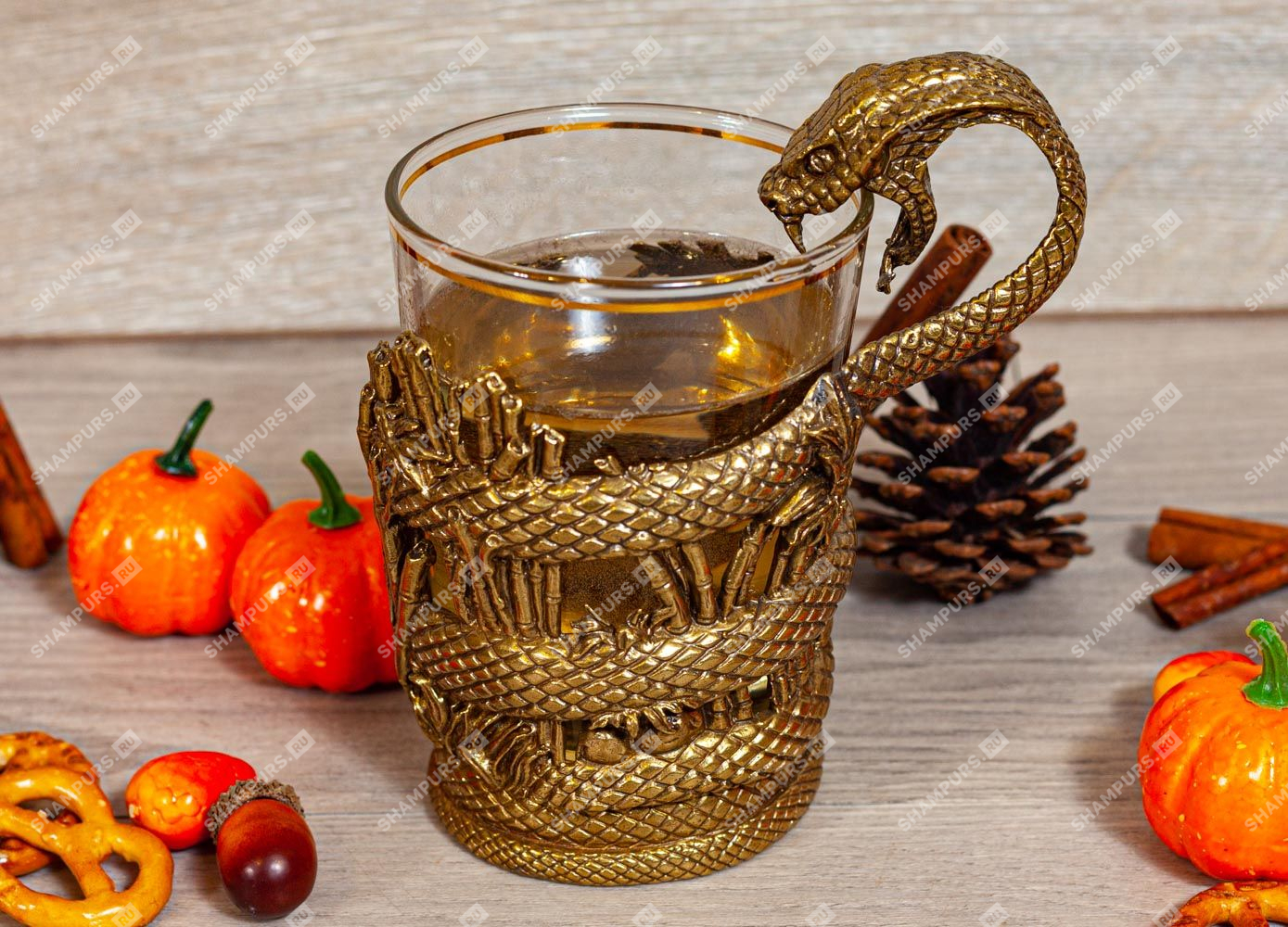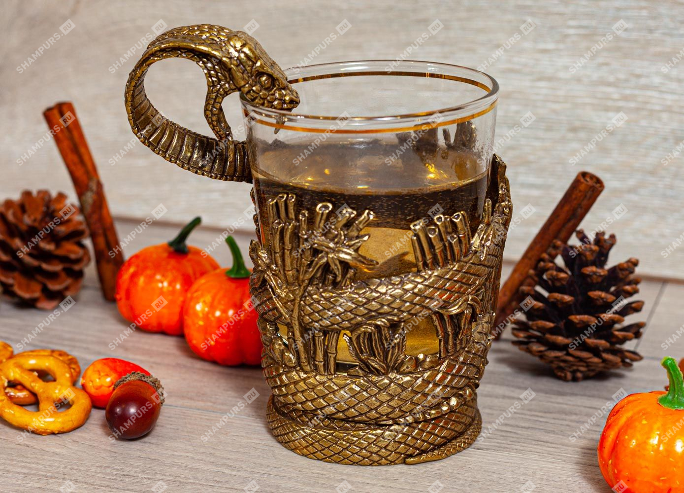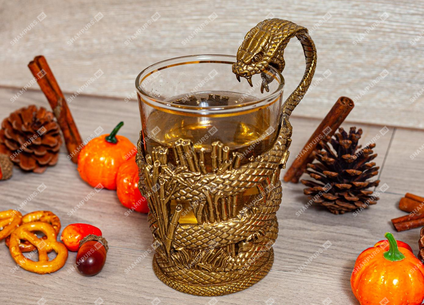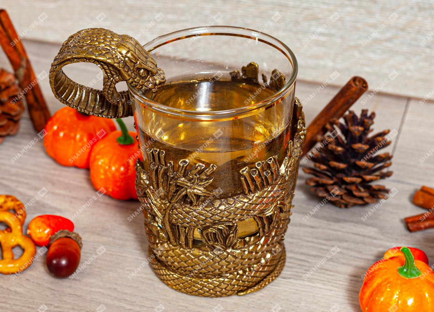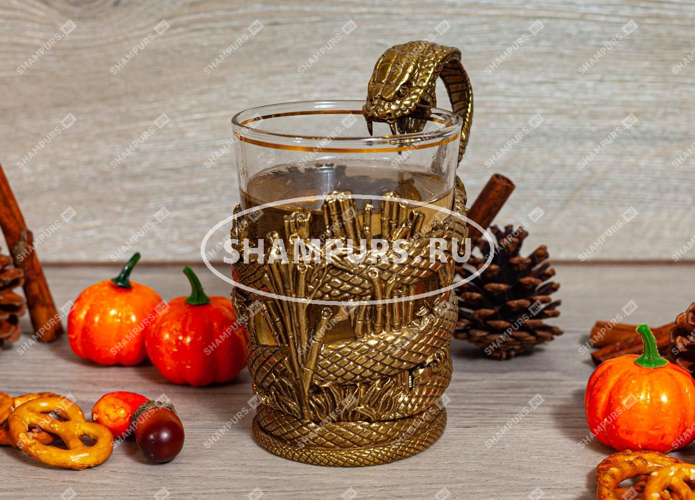 Стакан для виски Змей Стеклянный стакан оплетает латунная змея, как бы пьющая из этого стакана. Блестящая шкурка, вылитая так искусно и достоверно, что змея кажется живой. Как известно, змея - символ мудрости, и поэтому это будет отличным подарком для мудрого, рассудительного человека. Упакованный в яркую дизайнерскую коробку с сатласным ложементом придется по вкусу человеку, знающему толк в культуре пития.