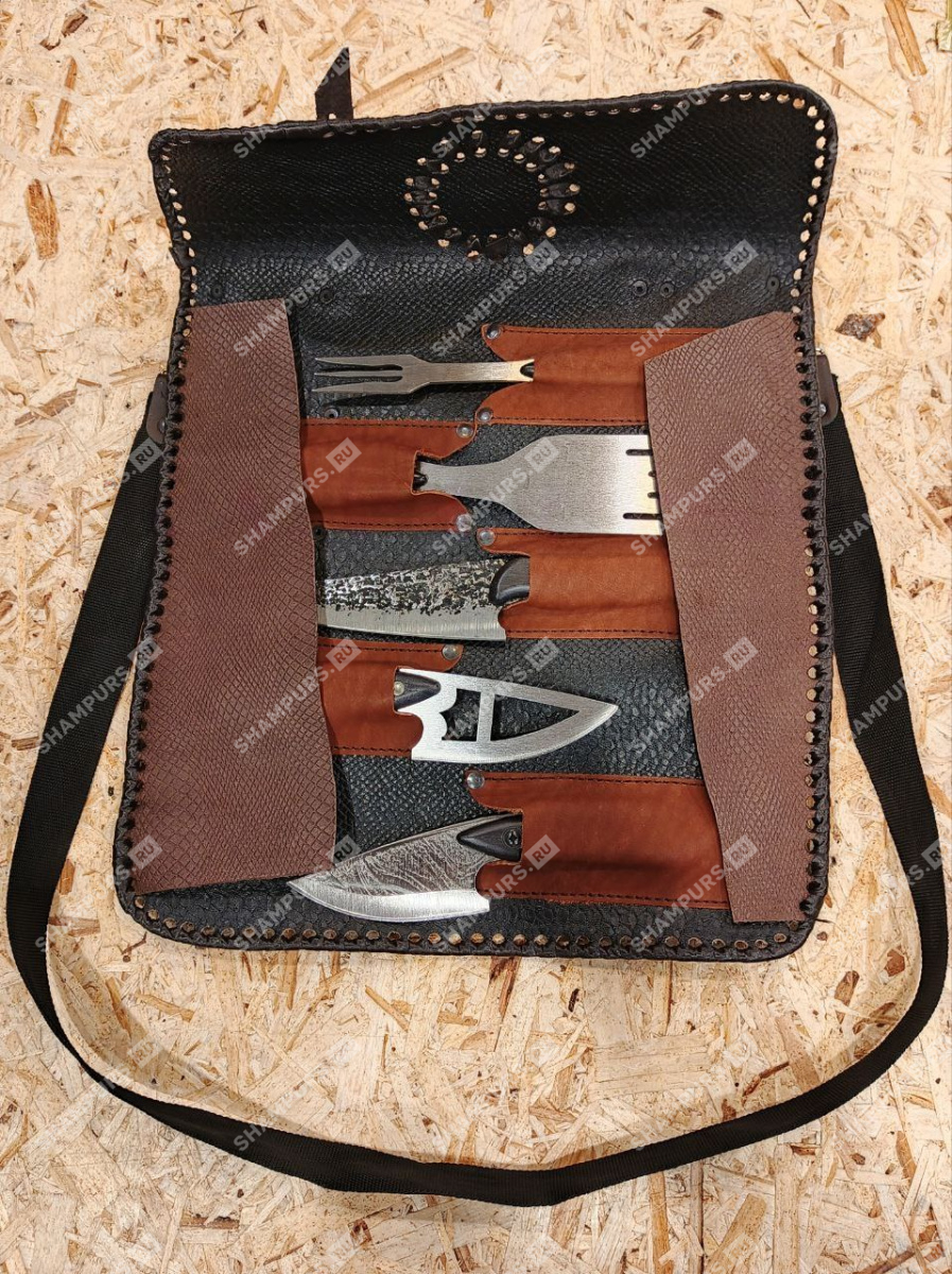 Имеет 5 кармашков для хранения ножей для нарезки, разделочных ножей и вилок для мяса. Также есть боковые шторки, благодаря которым острые изделия точно не выпадут и не поранят вас. Также имеет ремешки для фиксации и ремень через плечо для переноски.