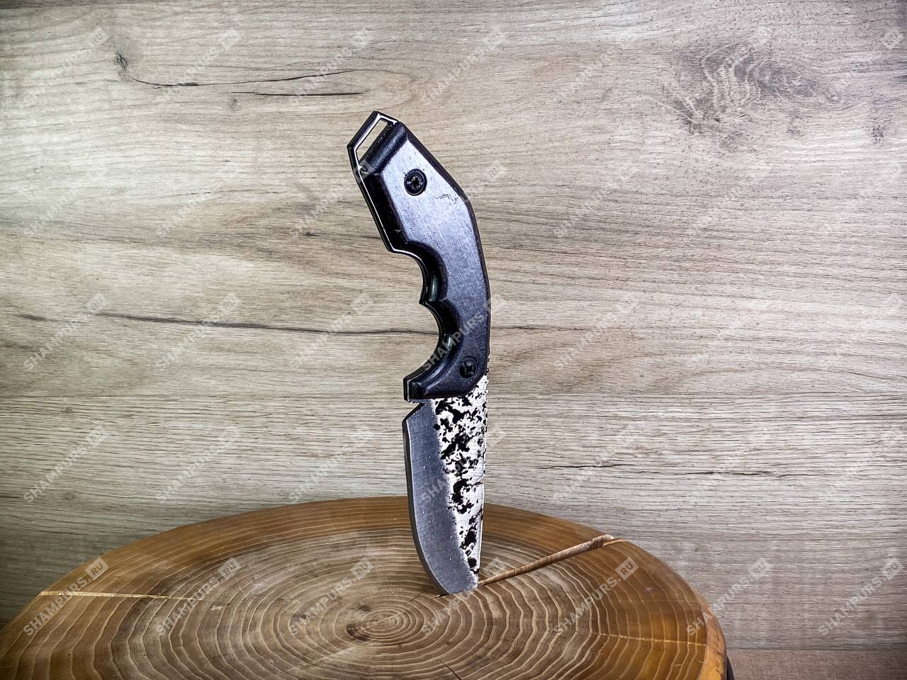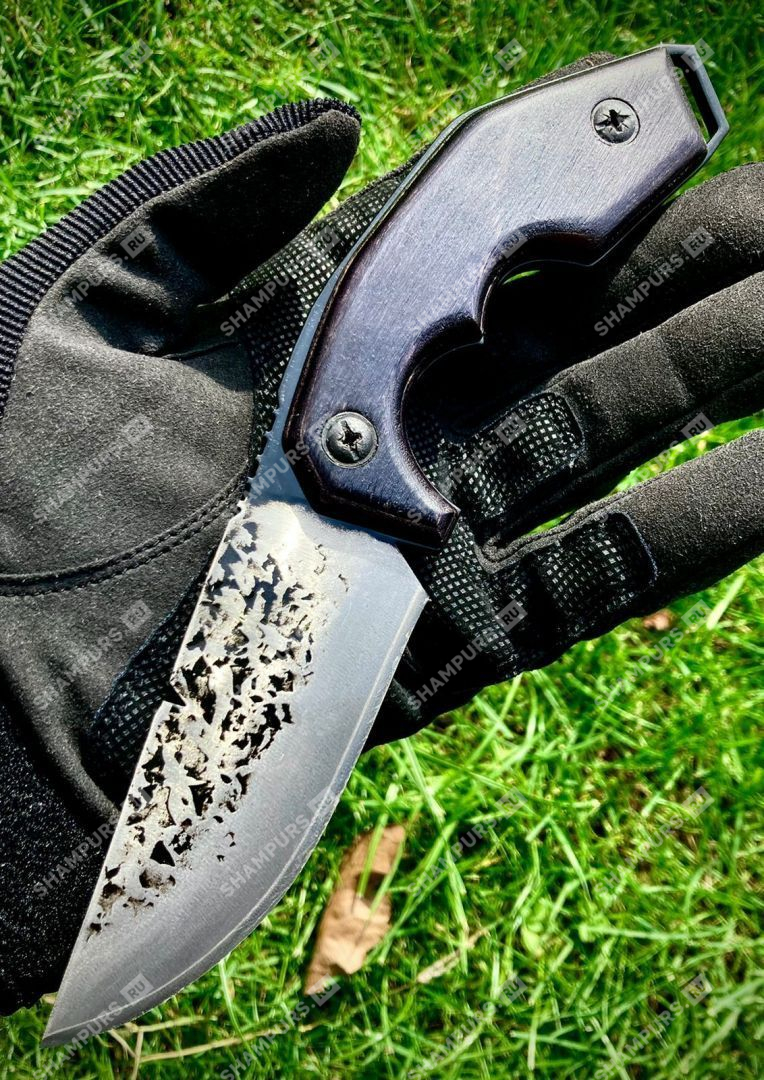 Нож цельнометаллический (толщина 4 мм ) с накладными ручками (лущеный шпон) : нож имеет укороченное, лезвие, подходящее для совершения коротких, мелких порезов по радиусу движения руки, что характерно для категории шкуросъёмных ножей.