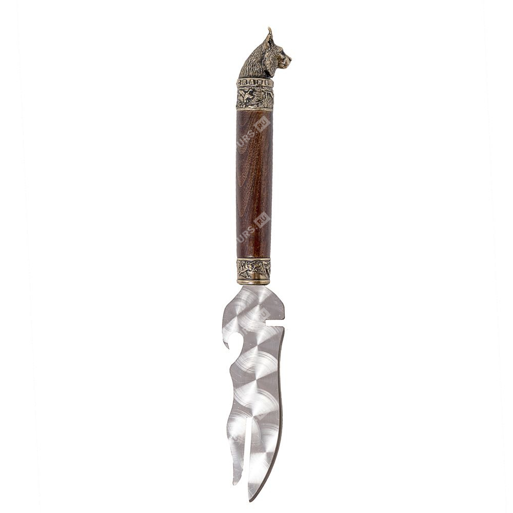 Предназначен для снятия шашлыка с шампуров, для снятия шампуров с мангала, для проверки готовности мяса, может быть использован в качестве вилки, чистка шампура от нагара, открытия бутылок, а так же может быть использован как обычный нож.